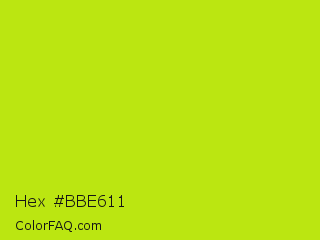 Hex #bbe611 Color is a normal lime color and the nearest color is Fuego #bede0d. Hex code #bbe611 and RGB value is rgb(187,230,17). In RGB color space, this color is composed of 73% red, 90% green, 7% blue, In CMYK color space, this color is composed of 19% cyan, 0% magenta, 93% yellow , 10% black , In HSL color space, this color has a hue angle of 72° , 86% saturation and 48% lightness.