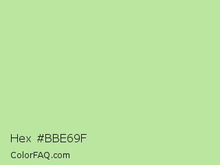 Hex #bbe69f Color is a light green color and the nearest color is Granny Smith Apple #a8e4a0. Hex code #bbe69f and RGB value is rgb(187,230,159). In RGB color space, this color is composed of 73% red, 90% green, 62% blue, In CMYK color space, this color is composed of 19% cyan, 0% magenta, 31% yellow , 10% black , In HSL color space, this color has a hue angle of 96° , 59% saturation and 76% lightness.