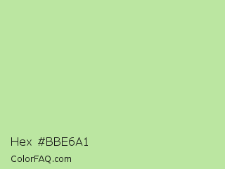 Hex #bbe6a1 Color is a light green color and the nearest color is Granny Smith Apple #a8e4a0. Hex code #bbe6a1 and RGB value is rgb(187,230,161). In RGB color space, this color is composed of 73% red, 90% green, 63% blue, In CMYK color space, this color is composed of 19% cyan, 0% magenta, 30% yellow , 10% black , In HSL color space, this color has a hue angle of 97° , 58% saturation and 77% lightness.