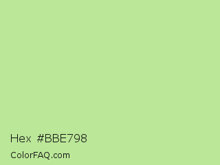 Hex #bbe798 Color is a light green color and the nearest color is Granny Smith Apple #a8e4a0. Hex code #bbe798 and RGB value is rgb(187,231,152). In RGB color space, this color is composed of 73% red, 91% green, 60% blue, In CMYK color space, this color is composed of 19% cyan, 0% magenta, 34% yellow , 9% black , In HSL color space, this color has a hue angle of 93° , 62% saturation and 75% lightness.