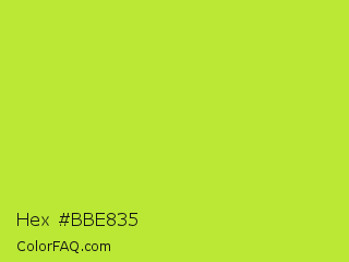 Hex #bbe835 Color is a normal lime color and the nearest color is Pear #d1e231. Hex code #bbe835 and RGB value is rgb(187,232,53). In RGB color space, this color is composed of 73% red, 91% green, 21% blue, In CMYK color space, this color is composed of 19% cyan, 0% magenta, 77% yellow , 9% black , In HSL color space, this color has a hue angle of 75° , 80% saturation and 56% lightness.