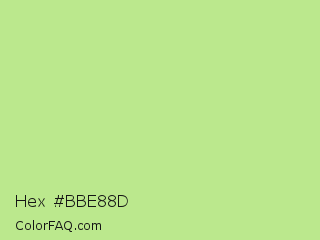 Hex #bbe88d Color is a light green color and the nearest color is Medium Spring Bud #c9dc87. Hex code #bbe88d and RGB value is rgb(187,232,141). In RGB color space, this color is composed of 73% red, 91% green, 55% blue, In CMYK color space, this color is composed of 19% cyan, 0% magenta, 39% yellow , 9% black , In HSL color space, this color has a hue angle of 90° , 66% saturation and 73% lightness.