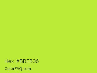 Hex #bbeb36 Color is a normal lime color and the nearest color is Green Lizard #a7f432. Hex code #bbeb36 and RGB value is rgb(187,235,54). In RGB color space, this color is composed of 73% red, 92% green, 21% blue, In CMYK color space, this color is composed of 20% cyan, 0% magenta, 77% yellow , 8% black , In HSL color space, this color has a hue angle of 76° , 82% saturation and 57% lightness.