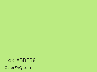 Hex #bbeb81 Color is a light green color and the nearest color is Sulu #c1f07c. Hex code #bbeb81 and RGB value is rgb(187,235,129). In RGB color space, this color is composed of 73% red, 92% green, 51% blue, In CMYK color space, this color is composed of 20% cyan, 0% magenta, 45% yellow , 8% black , In HSL color space, this color has a hue angle of 87° , 73% saturation and 71% lightness.