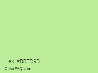 Hex #bbed9b Color is a light green color and the nearest color is Granny Smith Apple #a8e4a0. Hex code #bbed9b and RGB value is rgb(187,237,155). In RGB color space, this color is composed of 73% red, 93% green, 61% blue, In CMYK color space, this color is composed of 21% cyan, 0% magenta, 35% yellow , 7% black , In HSL color space, this color has a hue angle of 97° , 69% saturation and 77% lightness.