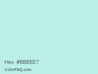 Hex #bbeee7 Color is a very light cyan color and the nearest color is Jagged Ice #c2e8e5. Hex code #bbeee7 and RGB value is rgb(187,238,231). In RGB color space, this color is composed of 73% red, 93% green, 91% blue, In CMYK color space, this color is composed of 21% cyan, 0% magenta, 3% yellow , 7% black , In HSL color space, this color has a hue angle of 172° , 60% saturation and 83% lightness.