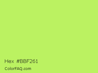 Hex #bbf261 Color is a light green color and the nearest color is Inchworm #b2ec5d. Hex code #bbf261 and RGB value is rgb(187,242,97). In RGB color space, this color is composed of 73% red, 95% green, 38% blue, In CMYK color space, this color is composed of 23% cyan, 0% magenta, 60% yellow , 5% black , In HSL color space, this color has a hue angle of 83° , 85% saturation and 66% lightness.