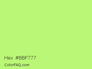 Hex #bbf777 Color is a light green color and the nearest color is Sulu #c1f07c. Hex code #bbf777 and RGB value is rgb(187,247,119). In RGB color space, this color is composed of 73% red, 97% green, 47% blue, In CMYK color space, this color is composed of 24% cyan, 0% magenta, 52% yellow , 3% black , In HSL color space, this color has a hue angle of 88° , 89% saturation and 72% lightness.