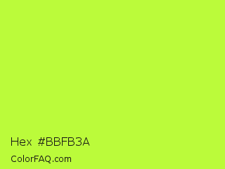 Hex #bbfb3a Color is a light green color and the nearest color is Green Yellow #adff2f. Hex code #bbfb3a and RGB value is rgb(187,251,58). In RGB color space, this color is composed of 73% red, 98% green, 23% blue, In CMYK color space, this color is composed of 25% cyan, 0% magenta, 77% yellow , 2% black , In HSL color space, this color has a hue angle of 80° , 96% saturation and 61% lightness.