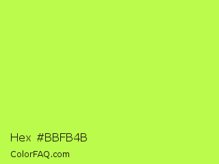 Hex #bbfb4b Color is a light green color and the nearest color is Inchworm #b2ec5d. Hex code #bbfb4b and RGB value is rgb(187,251,75). In RGB color space, this color is composed of 73% red, 98% green, 29% blue, In CMYK color space, this color is composed of 25% cyan, 0% magenta, 70% yellow , 2% black , In HSL color space, this color has a hue angle of 82° , 96% saturation and 64% lightness.