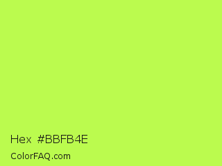 Hex #bbfb4e Color is a light green color and the nearest color is Inchworm #b2ec5d. Hex code #bbfb4e and RGB value is rgb(187,251,78). In RGB color space, this color is composed of 73% red, 98% green, 31% blue, In CMYK color space, this color is composed of 25% cyan, 0% magenta, 69% yellow , 2% black , In HSL color space, this color has a hue angle of 82° , 96% saturation and 65% lightness.