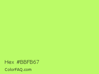 Hex #bbfb67 Color is a light green color and the nearest color is Inchworm #b2ec5d. Hex code #bbfb67 and RGB value is rgb(187,251,103). In RGB color space, this color is composed of 73% red, 98% green, 40% blue, In CMYK color space, this color is composed of 25% cyan, 0% magenta, 59% yellow , 2% black , In HSL color space, this color has a hue angle of 86° , 95% saturation and 69% lightness.