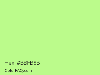 Hex #bbfb8b Color is a light green color and the nearest color is Sulu #c1f07c. Hex code #bbfb8b and RGB value is rgb(187,251,139). In RGB color space, this color is composed of 73% red, 98% green, 55% blue, In CMYK color space, this color is composed of 25% cyan, 0% magenta, 45% yellow , 2% black , In HSL color space, this color has a hue angle of 94° , 93% saturation and 76% lightness.