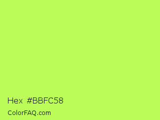 Hex #bbfc58 Color is a light green color and the nearest color is Inchworm #b2ec5d. Hex code #bbfc58 and RGB value is rgb(187,252,88). In RGB color space, this color is composed of 73% red, 99% green, 35% blue, In CMYK color space, this color is composed of 26% cyan, 0% magenta, 65% yellow , 1% black , In HSL color space, this color has a hue angle of 84° , 96% saturation and 67% lightness.