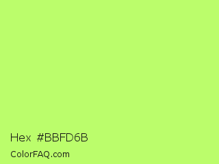 Hex #bbfd6b Color is a light green color and the nearest color is Sulu #c1f07c. Hex code #bbfd6b and RGB value is rgb(187,253,107). In RGB color space, this color is composed of 73% red, 99% green, 42% blue, In CMYK color space, this color is composed of 26% cyan, 0% magenta, 58% yellow , 1% black , In HSL color space, this color has a hue angle of 87° , 97% saturation and 71% lightness.
