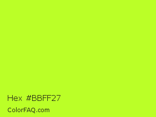 Hex #bbff27 Color is a normal lime color and the nearest color is Green Yellow #adff2f. Hex code #bbff27 and RGB value is rgb(187,255,39). In RGB color space, this color is composed of 73% red, 100% green, 15% blue, In CMYK color space, this color is composed of 27% cyan, 0% magenta, 85% yellow , 0% black , In HSL color space, this color has a hue angle of 79° , 100% saturation and 58% lightness.