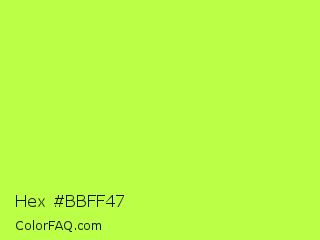 Hex #bbff47 Color is a light green color and the nearest color is Green Yellow #adff2f. Hex code #bbff47 and RGB value is rgb(187,255,71). In RGB color space, this color is composed of 73% red, 100% green, 28% blue, In CMYK color space, this color is composed of 27% cyan, 0% magenta, 72% yellow , 0% black , In HSL color space, this color has a hue angle of 82° , 100% saturation and 64% lightness.