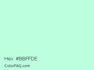 Hex #bbffde Color is a very light green color and the nearest color is Aero Blue #c9ffe5. Hex code #bbffde and RGB value is rgb(187,255,222). In RGB color space, this color is composed of 73% red, 100% green, 87% blue, In CMYK color space, this color is composed of 27% cyan, 0% magenta, 13% yellow , 0% black , In HSL color space, this color has a hue angle of 151° , 100% saturation and 87% lightness.