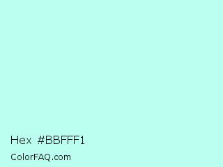 Hex #bbfff1 Color is a very light cyan color and the nearest color is Mint Tulip #c4f4eb. Hex code #bbfff1 and RGB value is rgb(187,255,241). In RGB color space, this color is composed of 73% red, 100% green, 95% blue, In CMYK color space, this color is composed of 27% cyan, 0% magenta, 5% yellow , 0% black , In HSL color space, this color has a hue angle of 168° , 100% saturation and 87% lightness.