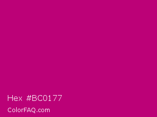 Hex #bc0177 Color is a normal magenta color and the nearest color is Lipstick #ab0563. Hex code #bc0177 and RGB value is rgb(188,1,119). In RGB color space, this color is composed of 74% red, 0% green, 47% blue, In CMYK color space, this color is composed of 0% cyan, 99% magenta, 37% yellow , 26% black , In HSL color space, this color has a hue angle of 322° , 99% saturation and 37% lightness.