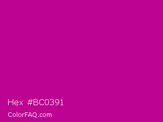 Hex #bc0391 Color is a normal magenta color and the nearest color is Red Violet #c71585. Hex code #bc0391 and RGB value is rgb(188,3,145). In RGB color space, this color is composed of 74% red, 1% green, 57% blue, In CMYK color space, this color is composed of 0% cyan, 98% magenta, 23% yellow , 26% black , In HSL color space, this color has a hue angle of 314° , 97% saturation and 37% lightness.