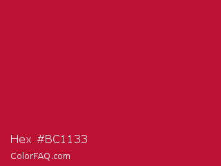 Hex #bc1133 Color is a normal red color and the nearest color is Shiraz #b20931. Hex code #bc1133 and RGB value is rgb(188,17,51). In RGB color space, this color is composed of 74% red, 7% green, 20% blue, In CMYK color space, this color is composed of 0% cyan, 91% magenta, 73% yellow , 26% black , In HSL color space, this color has a hue angle of 348° , 83% saturation and 40% lightness.
