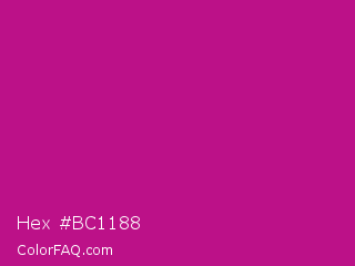 Hex #bc1188 Color is a normal magenta color and the nearest color is Red Violet #c71585. Hex code #bc1188 and RGB value is rgb(188,17,136). In RGB color space, this color is composed of 74% red, 7% green, 53% blue, In CMYK color space, this color is composed of 0% cyan, 91% magenta, 28% yellow , 26% black , In HSL color space, this color has a hue angle of 318° , 83% saturation and 40% lightness.