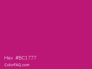 Hex #bc1777 Color is a normal magenta color and the nearest color is Magenta Dye #ca1f7b. Hex code #bc1777 and RGB value is rgb(188,23,119). In RGB color space, this color is composed of 74% red, 9% green, 47% blue, In CMYK color space, this color is composed of 0% cyan, 88% magenta, 37% yellow , 26% black , In HSL color space, this color has a hue angle of 325° , 78% saturation and 41% lightness.