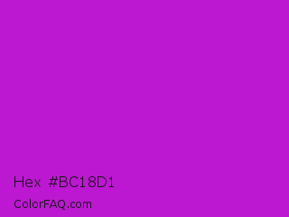Hex #bc18d1 Color is a normal magenta color and the nearest color is Vivid Mulberry #b80ce3. Hex code #bc18d1 and RGB value is rgb(188,24,209). In RGB color space, this color is composed of 74% red, 9% green, 82% blue, In CMYK color space, this color is composed of 10% cyan, 89% magenta, 0% yellow , 18% black , In HSL color space, this color has a hue angle of 293° , 79% saturation and 46% lightness.