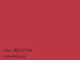 Hex #bc3744 Color is a normal red color and the nearest color is Brick Red #c62d42. Hex code #bc3744 and RGB value is rgb(188,55,68). In RGB color space, this color is composed of 74% red, 22% green, 27% blue, In CMYK color space, this color is composed of 0% cyan, 71% magenta, 64% yellow , 26% black , In HSL color space, this color has a hue angle of 354° , 55% saturation and 48% lightness.