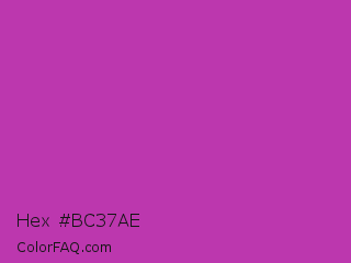 Hex #bc37ae Color is a normal magenta color and the nearest color is Byzantine #bd33a4. Hex code #bc37ae and RGB value is rgb(188,55,174). In RGB color space, this color is composed of 74% red, 22% green, 68% blue, In CMYK color space, this color is composed of 0% cyan, 71% magenta, 7% yellow , 26% black , In HSL color space, this color has a hue angle of 306° , 55% saturation and 48% lightness.