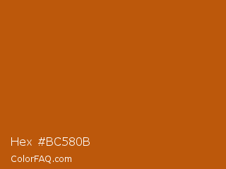 Hex #bc580b Color is a normal orange color and the nearest color is Rose Of Sharon #bf5500. Hex code #bc580b and RGB value is rgb(188,88,11). In RGB color space, this color is composed of 74% red, 35% green, 4% blue, In CMYK color space, this color is composed of 0% cyan, 53% magenta, 94% yellow , 26% black , In HSL color space, this color has a hue angle of 26° , 89% saturation and 39% lightness.