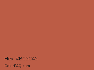 Hex #bc5c45 Color is a normal red color and the nearest color is Crail #b95140. Hex code #bc5c45 and RGB value is rgb(188,92,69). In RGB color space, this color is composed of 74% red, 36% green, 27% blue, In CMYK color space, this color is composed of 0% cyan, 51% magenta, 63% yellow , 26% black , In HSL color space, this color has a hue angle of 12° , 47% saturation and 50% lightness.