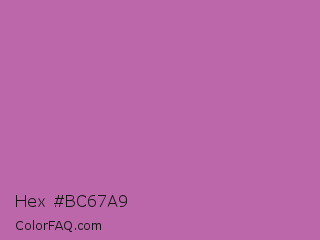 Hex #bc67a9 Color is a normal magenta color and the nearest color is Pearly Purple #b768a2. Hex code #bc67a9 and RGB value is rgb(188,103,169). In RGB color space, this color is composed of 74% red, 40% green, 66% blue, In CMYK color space, this color is composed of 0% cyan, 45% magenta, 10% yellow , 26% black , In HSL color space, this color has a hue angle of 313° , 39% saturation and 57% lightness.