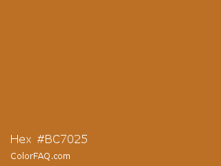 Hex #bc7025 Color is a normal orange color and the nearest color is Liver Dogs #b86d29. Hex code #bc7025 and RGB value is rgb(188,112,37). In RGB color space, this color is composed of 74% red, 44% green, 15% blue, In CMYK color space, this color is composed of 0% cyan, 40% magenta, 80% yellow , 26% black , In HSL color space, this color has a hue angle of 30° , 67% saturation and 44% lightness.