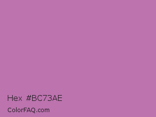 Hex #bc73ae Color is a normal magenta color and the nearest color is Pearly Purple #b768a2. Hex code #bc73ae and RGB value is rgb(188,115,174). In RGB color space, this color is composed of 74% red, 45% green, 68% blue, In CMYK color space, this color is composed of 0% cyan, 39% magenta, 7% yellow , 26% black , In HSL color space, this color has a hue angle of 312° , 35% saturation and 59% lightness.