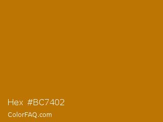 Hex #bc7402 Color is a normal orange color and the nearest color is Indochine #c26b03. Hex code #bc7402 and RGB value is rgb(188,116,2). In RGB color space, this color is composed of 74% red, 45% green, 1% blue, In CMYK color space, this color is composed of 0% cyan, 38% magenta, 99% yellow , 26% black , In HSL color space, this color has a hue angle of 37° , 98% saturation and 37% lightness.