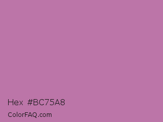 Hex #bc75a8 Color is a normal magenta color and the nearest color is Pearly Purple #b768a2. Hex code #bc75a8 and RGB value is rgb(188,117,168). In RGB color space, this color is composed of 74% red, 46% green, 66% blue, In CMYK color space, this color is composed of 0% cyan, 38% magenta, 11% yellow , 26% black , In HSL color space, this color has a hue angle of 317° , 35% saturation and 60% lightness.