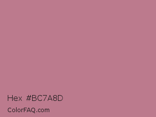 Hex #bc7a8d Color is a light rose color and the nearest color is Old Rose #c08081. Hex code #bc7a8d and RGB value is rgb(188,122,141). In RGB color space, this color is composed of 74% red, 48% green, 55% blue, In CMYK color space, this color is composed of 0% cyan, 35% magenta, 25% yellow , 26% black , In HSL color space, this color has a hue angle of 343° , 33% saturation and 61% lightness.