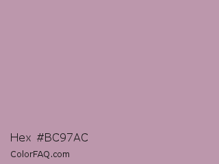 Hex #bc97ac Color is a light magenta color and the nearest color is Lilac Luster #ae98aa. Hex code #bc97ac and RGB value is rgb(188,151,172). In RGB color space, this color is composed of 74% red, 59% green, 67% blue, In CMYK color space, this color is composed of 0% cyan, 20% magenta, 9% yellow , 26% black , In HSL color space, this color has a hue angle of 326° , 22% saturation and 66% lightness.