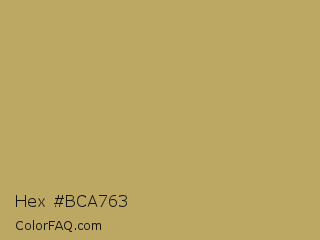 Hex #bca763 Color is a normal yellow color and the nearest color is Husk #b7a458. Hex code #bca763 and RGB value is rgb(188,167,99). In RGB color space, this color is composed of 74% red, 65% green, 39% blue, In CMYK color space, this color is composed of 0% cyan, 11% magenta, 47% yellow , 26% black , In HSL color space, this color has a hue angle of 46° , 40% saturation and 56% lightness.
