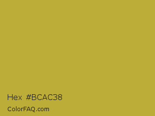 Hex #bcac38 Color is a normal yellow color and the nearest color is Brass #b5a642. Hex code #bcac38 and RGB value is rgb(188,172,56). In RGB color space, this color is composed of 74% red, 67% green, 22% blue, In CMYK color space, this color is composed of 0% cyan, 9% magenta, 70% yellow , 26% black , In HSL color space, this color has a hue angle of 53° , 54% saturation and 48% lightness.