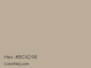 Hex #bcad98 Color is a light orange color and the nearest color is Heathered Gray #b6b095. Hex code #bcad98 and RGB value is rgb(188,173,152). In RGB color space, this color is composed of 74% red, 68% green, 60% blue, In CMYK color space, this color is composed of 0% cyan, 8% magenta, 19% yellow , 26% black , In HSL color space, this color has a hue angle of 35° , 21% saturation and 67% lightness.