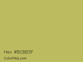 Hex #bcbb5f Color is a normal yellow color and the nearest color is Celery #b8c25d. Hex code #bcbb5f and RGB value is rgb(188,187,95). In RGB color space, this color is composed of 74% red, 73% green, 37% blue, In CMYK color space, this color is composed of 0% cyan, 1% magenta, 49% yellow , 26% black , In HSL color space, this color has a hue angle of 59° , 41% saturation and 55% lightness.