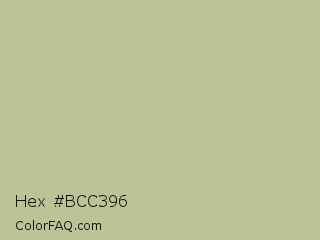 Hex #bcc396 Color is a light yellow color and the nearest color is Pine Glade #c7cd90. Hex code #bcc396 and RGB value is rgb(188,195,150). In RGB color space, this color is composed of 74% red, 76% green, 59% blue, In CMYK color space, this color is composed of 4% cyan, 0% magenta, 23% yellow , 24% black , In HSL color space, this color has a hue angle of 69° , 27% saturation and 68% lightness.