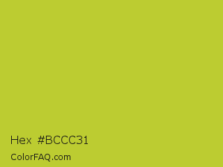 Hex #bccc31 Color is a normal yellow color and the nearest color is Key Lime Pie #bfc921. Hex code #bccc31 and RGB value is rgb(188,204,49). In RGB color space, this color is composed of 74% red, 80% green, 19% blue, In CMYK color space, this color is composed of 8% cyan, 0% magenta, 76% yellow , 20% black , In HSL color space, this color has a hue angle of 66° , 61% saturation and 50% lightness.
