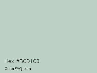 Hex #bcd1c3 Color is a light green color and the nearest color is Surf #bbd7c1. Hex code #bcd1c3 and RGB value is rgb(188,209,195). In RGB color space, this color is composed of 74% red, 82% green, 76% blue, In CMYK color space, this color is composed of 10% cyan, 0% magenta, 7% yellow , 18% black , In HSL color space, this color has a hue angle of 140° , 19% saturation and 78% lightness.