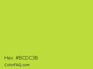 Hex #bcdc3b Color is a normal lime color and the nearest color is Pear #d1e231. Hex code #bcdc3b and RGB value is rgb(188,220,59). In RGB color space, this color is composed of 74% red, 86% green, 23% blue, In CMYK color space, this color is composed of 15% cyan, 0% magenta, 73% yellow , 14% black , In HSL color space, this color has a hue angle of 72° , 70% saturation and 55% lightness.