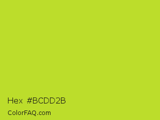 Hex #bcdd2b Color is a normal lime color and the nearest color is Pear #d1e231. Hex code #bcdd2b and RGB value is rgb(188,221,43). In RGB color space, this color is composed of 74% red, 87% green, 17% blue, In CMYK color space, this color is composed of 15% cyan, 0% magenta, 81% yellow , 13% black , In HSL color space, this color has a hue angle of 71° , 72% saturation and 52% lightness.