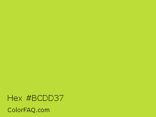 Hex #bcdd37 Color is a normal lime color and the nearest color is Pear #d1e231. Hex code #bcdd37 and RGB value is rgb(188,221,55). In RGB color space, this color is composed of 74% red, 87% green, 22% blue, In CMYK color space, this color is composed of 15% cyan, 0% magenta, 75% yellow , 13% black , In HSL color space, this color has a hue angle of 72° , 71% saturation and 54% lightness.